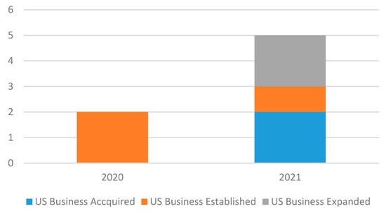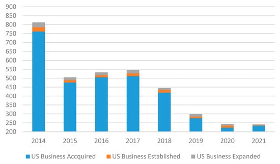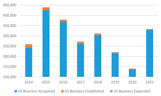 First-year Investment Expenditures (million USD) of New FDI in the US, 2014–2021 (Data Source: U.S. Bureau of Economic Analysis).