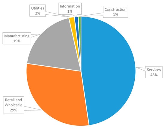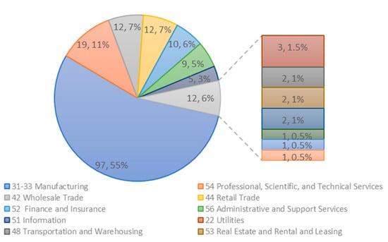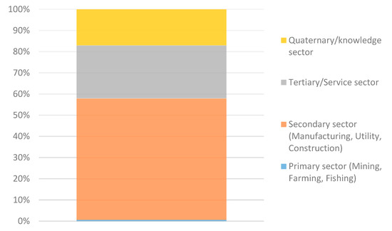 In the Tertiary Sector, the wholesale trade industry (NACIS 42) and the retail trade industry (NACIS 44) each has 7 percent of the parent companies, followed by the finance and insurance industry (NAICS 52, 6 percent) and the information sector (NAICS 55, 3 percent). The Quaternary Sector is also referred to as the Knowledge Sector, in which the professional, scientific, and technical services industry (NAICS 54) is the second largest single industry (next to the manufacturing) with a share of 11 percent of all parent companies, followed by the administrative and support services industry (NAICS 56, 5 percent) and the management of companies and enterprises industry (NAICS 55, 1 percent). Only one parent company from the mining, quarrying, and oil extraction industry (NAICS 21) is in the Primary Sector.