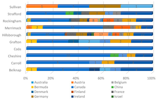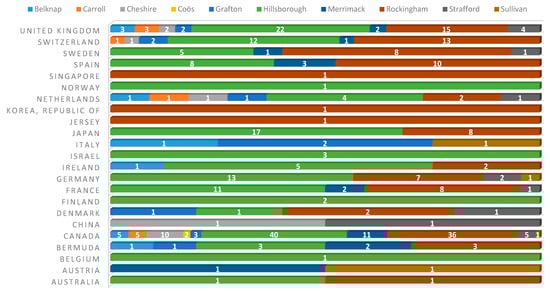 Foreign Subsidiaries in New Hampshire Counties, by Country of Origin.