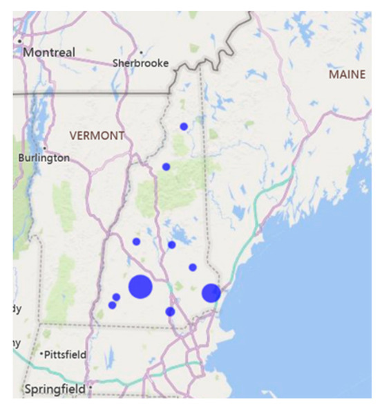 When the foreign subsidiaries are scatter plotted among the counties in New Hampshire, a pattern of FDI agglomeration is revealed. The bubbles in Figure 17 vary in size because they measure the count of foreign subsidiaries for each county. The foreign subsidiaries cluster along the Massachusetts–New Hampshire border and the coast area. They spill over to the central part of the state. The FDI presence in the North Country is attributed to the border effect from Canada.