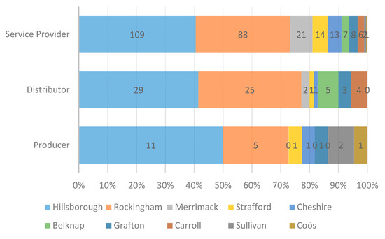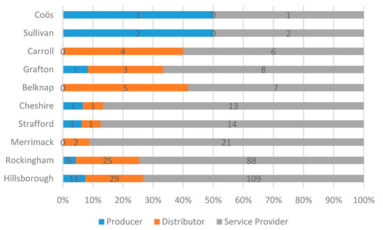 When the New Hampshire counties are profiled by their foreign subsidiaries across the value chain activities, a geographic pattern in the relative importance of value chain activities is revealed. The foreign subsidiaries in the southern counties (Hillsborough, Rockingham, Merrimack, Strafford, and Cheshire) are dominated by the service providers. A main reason is their proximity to Massachusetts which is the economic center of the region. The proportion of distributors (retailers and wholesalers) among the foreign subsidiaries significantly increases and is almost the same with service providers for the inner center counties (Belknap, Grafton, and Carroll). This highlights the importance of central New Hampshire as the shopping center for the northern area and as their gateway to the bigger southern market. For the North Country and Sullivan, the share of producers is equal to the share of service providers among their foreign subsidiaries, suggesting the potential to grow the manufacturing FDI in this area. Figure 20 below details the data.