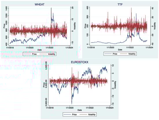 Wheat, TTF and Eurostoxx 50 prices and volatility.