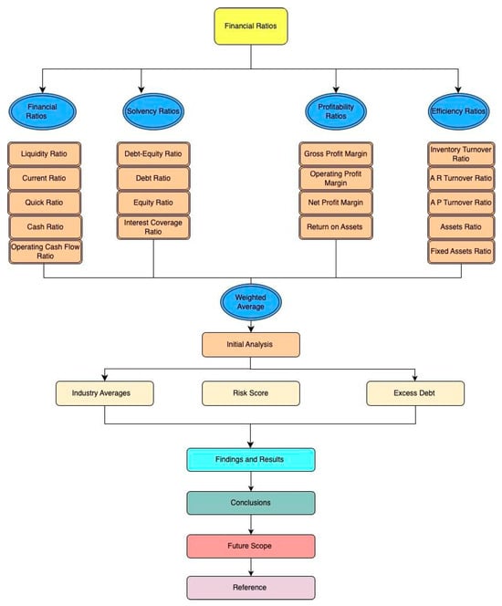 As per (), the GFC that engulfed the United States in 2008 was primarily a consequence of unsustainable debt-to-income ratios within private households, largely attributed to excessive financial obligations such as mortgages. Similarly, the financial crisis of the 1980s was closely tied to the business sector while also being intertwined with mounting levels of debt. Motivated by this, we calculated the excess debt and compared it to the industry average. The flow chart below illustrates the methodology adopted in this research paper.