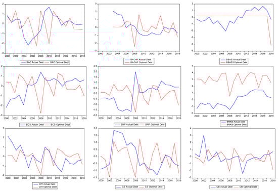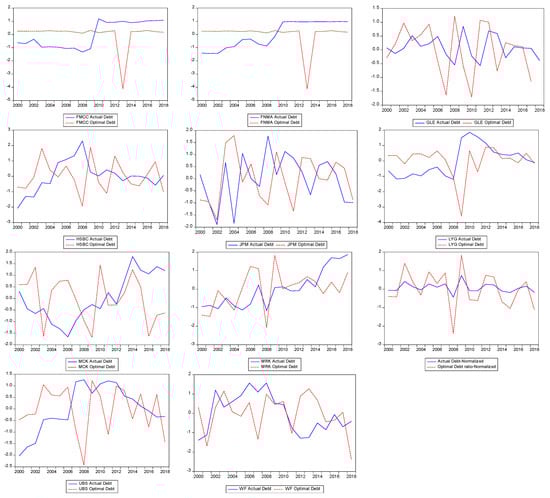 The vertical axes of Figure 2 and Figure 3 represent the debt ratios for each company, while the horizontal axes represent the years. Figure 2 shows the optimal debt against the actual debt ratios for the financial industry, and Figure 3 shows the excess debt for the same time period. Please note that the excess debt is the difference between optimal and actual debt.