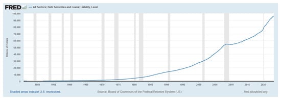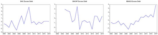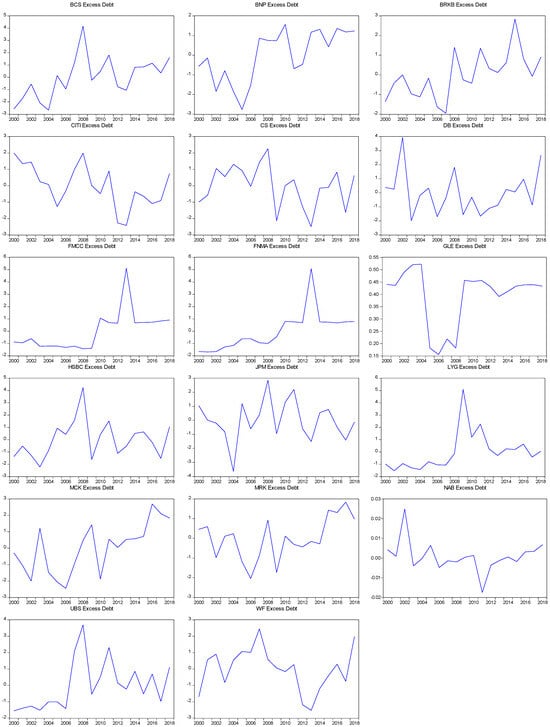 We have considered the excess debt of each company over the period 2000–2018. Excess debt was defined by () as the difference between the actual and optimal debt. For the calculation of excess and optimal debt, please see (). In each scenario, Stein made it clear that the primary source of the problem was not the presence of debt but excess debt within the country’s firms under analysis. Stein’s early warning signal of a debt crisis is based on the excess debt of households as a difference between the actual debt-to-assets ratio and the optimal debt ratio. Consequently, as the excess-debt ratio rises, the probability of a debt crisis increases. As the excess debt level rises, the probability of a debt crisis increases, as was the case in the 2008 crisis. The financial sector, by nature of the business and not necessarily by volatility indicators, has one of the highest excess debt ratios.
