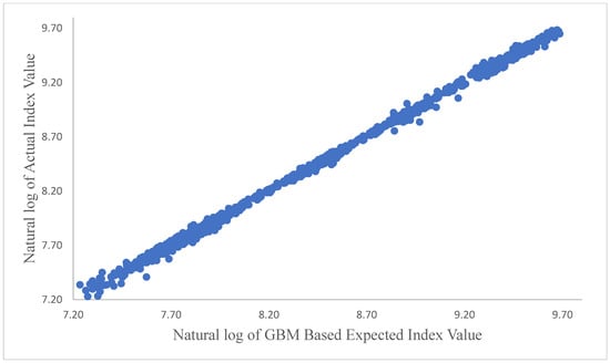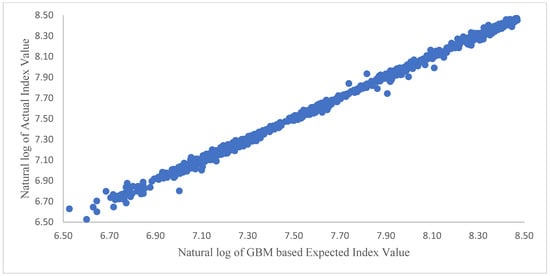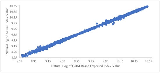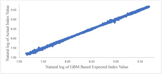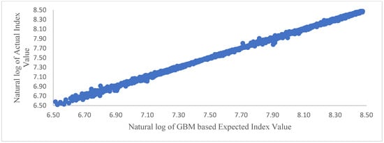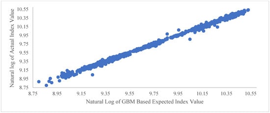 The results of regression Equation (8) for the daily frequency are presented in Table 2. As it was hypothesized, for the GBM-based expected index values to be reliable predictors of the actual index value, the intercept term, α, in regression Equation (12) should have a value of zero, while the coefficient of the expected value, β, should have a value of 1. The results presented in Table 2 are consistent with this hypothesis. The expected index value in Table 2 is based on one thousand GBM simulations.