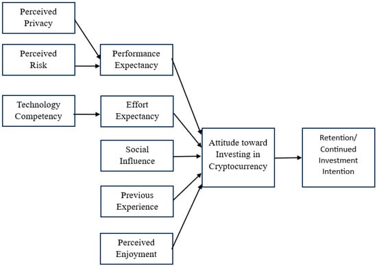 Previous research has shown that UTAUT can explain over 70% of new technology usage intentions (), highlighting its relevance for understanding cryptocurrency investment behaviors. This study extends that research trail and fills some of the existing gaps in the literature by applying UTAUT to explore how its key components—performance expectancy, effort expectancy, and social influence—affect attitudes toward cryptocurrency investment and intentions to continue investing. The simplicity of the UTAUT has led to it becoming a widely accepted framework used for investigating technology acceptance. Nevertheless, the simplicity of the UTAUT falls short in explaining the multifaceted nature of user behavior (; ) in emerging technologies such as cryptocurrency. This study’s addition of factors such as perceived risk, privacy concerns, and technological competency address the need to explore the UTAUT at a deeper level beyond its original simplicity. The inclusion of the perceived enjoyment and previous experience factors in the UTAUT framework takes a step in addressing missing emotional and motivational aspects () that may form investors’ attitudes toward cryptocurrency.