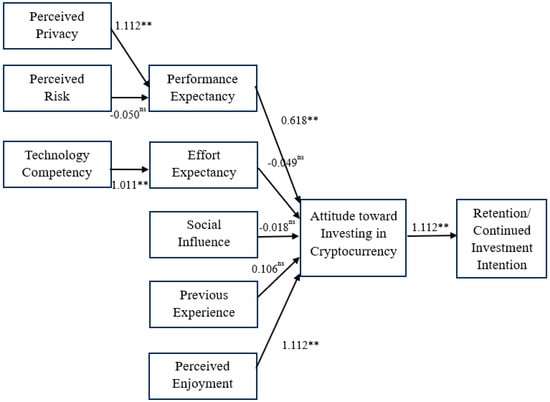 Factors influencing intention to continue to invest in cryptocurrency. ns indicates no significance; ** indicates significance level < 0.001.