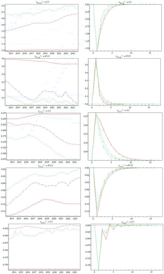 Acute risks involve the potential for immediate and severe negative impacts triggered by specific events or exposures. These risks include the heightened intensity of extreme weather events, such as cryogenic freezing, typhoons, and floods, which cause sudden, short-term, and significant disruptions that demand urgent response (TCFD 2017). In Figure 3, we find that the responses of WTI oil prices and coal prices to waterlogging by rain and typhoons are completely opposite to each other. While waterlogging by rain risk exerts negative impacts on coal prices, it yields positive impacts on WTI oil prices, while typhoon risks have positive effects on coal prices and negative effects on WTI oil prices. The impacts are strong in the short term and tend to be weak in the medium term and long term, which means that the trend increases initially and decreases after that. Interestingly, the cryogenic freezing risk has distinct effects on WTI crude oil prices and coal prices. It exerts a negative impact on coal prices, with a trend weakening from strong to weak. In contrast, it has a short-term negative impact on WTI oil prices, turning positive in the medium term and becoming negative again in the long term, characterized by a fluctuating trend.