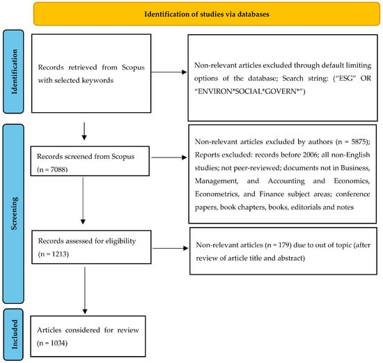 In the initial screening stage, the search query “ESG” OR “ENVIRON*SOCIAL*GOVERN*” was entered in Scopus to retrieve the information needed in the ESG section. This means that, wherever these words appeared in the title, abstract, or keywords of a paper, they were gathered for additional analysis. This procedure yielded 7088 initial results, which were further refined using the following specific criteria: (i) articles covered should be published from 2006 to 2022; (ii) publications other than journal articles, such as book chapters, conference papers, notes, etc., were excluded; (iii) only articles written in the English language were included; (iv) the category of discipline contained “Business, Management, and Accounting and “Economics, Econometrics, and Finance”, as this is the focal field of interest, in accordance with Scopus; (v) only established journals were chosen by using Academic Journal Guide 2021 and ABDC 2022 ranking lists. With these criteria, we defined the minimum level of research quality, making sure that findings derived from reliable and credible articles (Alhossini et al. 2021). Documents were then screened to determine their relevance to the topic covered. Further criteria have been applied to identify papers that explicitly mention ESG coverage, and a subsequent review of the article title, abstract and keywords has been carried out to exclude any pieces of pertinent literature that do not fall within the scope of this domain. According to Frandsen (2017) this step is considered to be critical for BA. In addition, the authors thoroughly reviewed papers in which the abstract was ambiguous. They then independently reviewed the corpus of literature to reduce the risk of bias and maintain reliability of the coding and analysis framework according to Tsalavoutas et al. (2020). Any discrepancies that occurred were then discussed and clarified, narrowing the initial sample down to 1034 articles considered sufficient for BA. Figure 1 is a summary of the search strategy for this research.