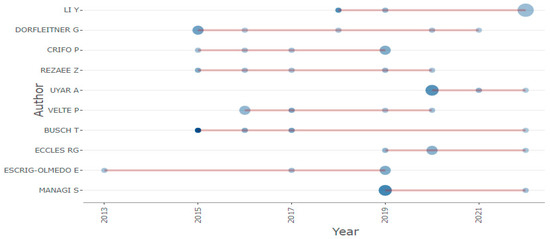 The graph also shows a dynamic change in the dominance of distinguished writers in the ESG sphere over time. Author dominance is a commonly used bibliometric measure (Hassanein and Mostafa 2023). From 2013 to 2019, Escrig-Olmedo E. emerged as the most active writer, while from 2015 to 2022, Busch T. held considerable sway. Furthermore, Dorfleitner G. dominated from 2015 to 2021, Razaee Z. from 2015 to 2020, and Velte P. from 2016 to 2020. However, new and highly influential writers also emerged, such as Managi S. (2019–2022), Eccles RG (2019–2022), and Uyar A. (2022–2022), signaling a diversification of authorial impact within the realm of ESG.