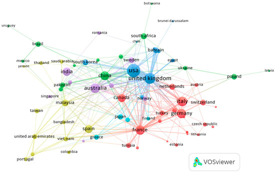Co-authorship collaboration map of the countries publishing ESG articles. Notes: This figure presents the collaboration network of countries which contributed at least five publications. The circle color represents the country’s cluster. Source: VOSviewer.