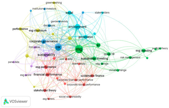 In the Thesaurus file, the terms “ESG” and “corporate social responsibility” occurred 320 and 211 times, respectively. The keywords “environment”, “sustainability”, “corporate governance”, and “socially responsible investment” appeared fairly often in the 1034 records. The main co-occurrences consisted of the CSR concept in blue and the term ESG in green. Both nodes connected to a huge number of related minor terms. For instance, CSR was most noticeably connected with “corporate governance”, “gender diversity” and “transparency”. ESG was strongly associated with “socially responsible investing”, “sustainable investing” and “ESG investing”.