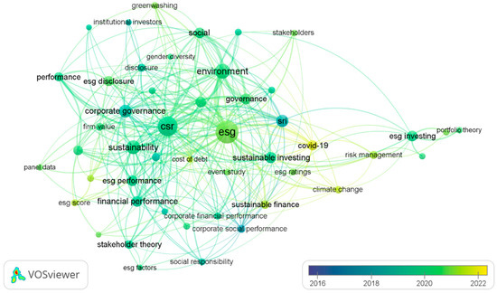 Figure 6 represents the results of the mapping analysis and shows the period during which the research was carried out (RQ5). The horizontal multicolor bar on the lower right side indicates the years the colors correspond to, with blue reflecting the early years and green and yellow depicting the later ones. The line between the keywords reflects subjects studied in conjunction, while the density of the line shows the intensity and strength of their relation. The size of the node indicates the significance of the label. For instance, the environment appears to have a greater impact than financial performance. The color of the name demonstrates the year the subject stems from. So, the light green group contains governance, sustainable investing, risk management research studies published around 2020. The highest frequency keywords appear in the years 2016 to 2019. Namely, ESG and ESG rating exploded in popularity and began to attract the attention of authors in 2021, with other research topics such as SRI and CSR appearing around 2017 and 2019, respectively.