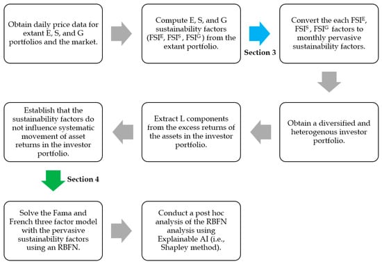 This study uses statistical techniques and artificial neural networks to propose an algorithmic protocol where investors use the ESG, E, S, and G nontraded factors to express asset return predictability. To proceed, we adopt the reasoning of () and collect assets to target the construction of specific sustainability factors., Specifically, we collect three large-cap portfolios formerly published by Refinitiv/LSEG as a component of their ESG ratings. The portfolios were formed from a curated list of companies exhibiting the best corporate social responsibility practices measured by Refinitiv/LSEG’s rating schema. The protocol supports exploratory factor analysis (EFA) to align after-market asset returns with common factor covariances. EFA effectively examines the structure relationship among variables, addresses multicollinearity, and can lead to the development of theoretical constructs (). Based on the notion that after-market returns serve as a proxy for idiosyncratic E, S, and G risk, the proposed protocol extracts three new latent factors to proxy E, S, and G factors individually in the U.S. capital markets using EFA and subsequent eigenvalue rotation with a factor-score generation technique.