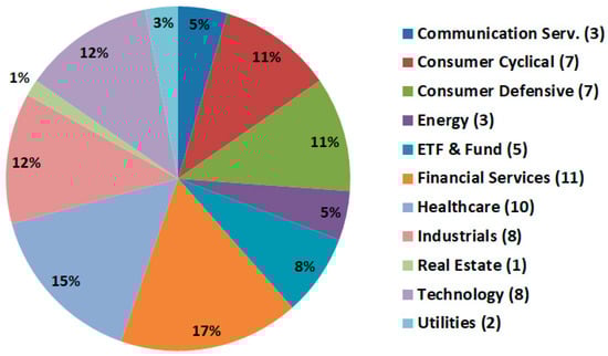 Following PRS, we identify an actual investor portfolio for valuation testing using the novel pervasive sustainability factors. The selection of an investor portfolio, although an arbitrary choice, should assure a degree of market coverage (i.e., diversification). The selected investor portfolio is described by n = 65 instruments representing 41 industries across 12 sectors. The Yahoo! industry and sector classifications for the investor portfolio are shown in Figure 3. The list of securities used in this research is provided in the Supplementary Materials.