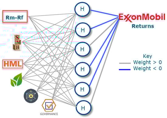 The K4-RBFN elasticity weights and the firm-related feature map provide evidence of the proportional impact of ESG features on asset returns. For example, in Figure 6, we show how each hidden node receives inputs from the neurons in the input layer and passes its output to the output layer. As a feedforward network, the single layer of hidden nodes accounts for the interconnected information complexity presented by the heterogeneous asset return predictability drivers (i.e., sustainability and various traded factors).