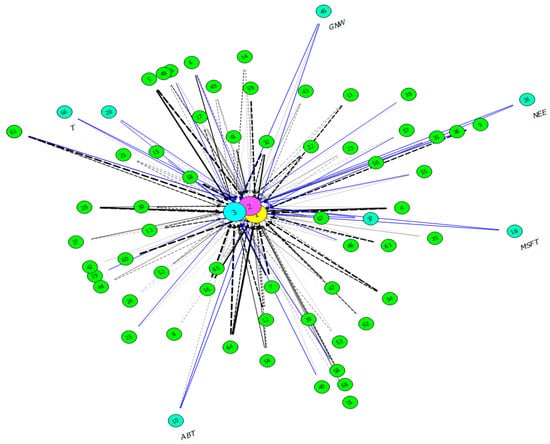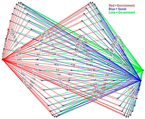Alternatively, Figure 8 shows the gravitational impact of each sustainability factor on the production of asset returns. The closer the company is to the centroid, the larger the elasticity weights of the sustainability factors. The network graph was created using NodeXL for Excel 2016 ().