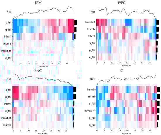 Figure 9 shows the Shapley heatmaps for the eight focus companies. The instances are shown on the x-axis, and the model inputs are on the y-axis, ordered by their global contribution (shown as a bar plot on the right-hand side) to the model output. The model output f(x) is centered around the base value and visible above the heatmap. In Figure 9, the SHAP values are encoded on a color scale, with red indicating positive and blue indicating negative. The samples are ordered based on hierarchical clustering by their explanation similarity. For example, for JPM, both the S and G factors have a low impact in the early instances. BAC shows the exact opposite in the early instances. Table 3 presents a summarized rank-order view of model inputs.