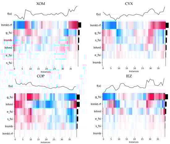 Combining the information from Table 3 and Figure 9 shows that the G factor is one of the most critical contributors to the formation of asset market returns. It ranks 1 or 2, except for the two banking companies (WFC and C). On the other hand, the E factor is consistently in the lower half of the ranking, with an importance rank of 4, 5, or 6. Again, the aberrance is the banking stock C and the oil stock COP, with an E factor rank of 3. When the S factor contributes, it works with the G factor. JPM and BAC’s heatmaps provide the most convincing evidence. Here, the S and G factors are marked extensively with red across the heatmap. This predominance of red indicates that these factors positively impact the mean SHAP value. The frequency and intensity of the red shading for these features across multiple instances reinforce that they play a significant role in the model’s algorithm, likely serving as vital indicators that sway the returns positively.