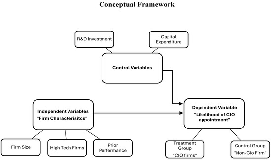 Appointing a CIO holds significant theoretical importance as it directly impacts IT governance, innovation, and a firm’s competitive advantage. The CIO plays a crucial role in aligning IT investments with business strategies, ensuring that technological initiatives support organizational goals (Enns et al. 2003; Wu et al. 2015). Firm characteristics are also known to shape IT strategies in various ways and are likely to influence a firm’s decision to appoint a CIO. Figure 1 presents the conceptual framework for understanding the factors that drive a firm’s decision to appoint a chief information officer (CIO) at the top management level.