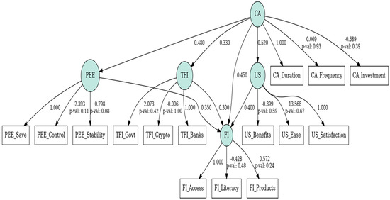 In this study, Structural Equation Modeling (SEM) was selected as the most appropriate method due to its ability to simultaneously analyze complex relationships between multiple observed and latent variables. SEM is particularly useful in this context because it allows for the examination of both direct and indirect effects, which is essential when exploring the interplay between cryptocurrency adoption (CA), financial inclusion (FI), user satisfaction (US), trust in financial institutions (TFI), and perceived economic empowerment (PEE). Unlike traditional regression analysis, which might only consider direct relationships between variables, SEM offers the flexibility to test a comprehensive theoretical model, accounting for the multidimensional nature of financial inclusion and economic empowerment.