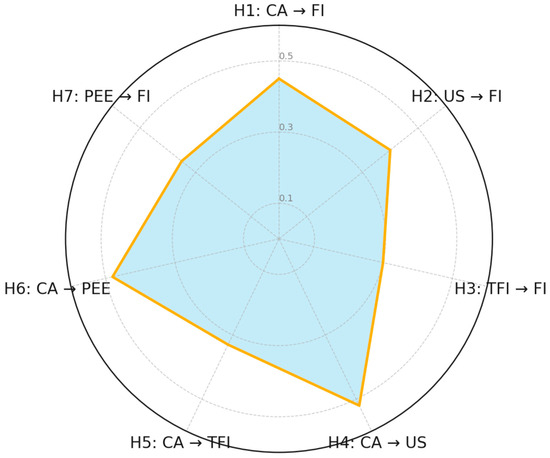 To shed light on the relationships and interdependencies that exist among the key variables and hypotheses discussed in this study, the research framework presented in Figure 1 explains the way in which cryptocurrency adoption (CA) influences financial inclusion (FI), user satisfaction (US), trust in financial institutions (TFI), and perceived economic empowerment (PEE) as well as their interrelated effects.