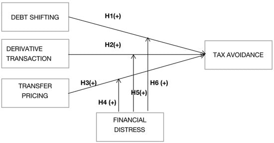 Theoretical framework of tax avoidance effect from debt shifting, derivatives, and transfer pricing with financial distress interaction.
