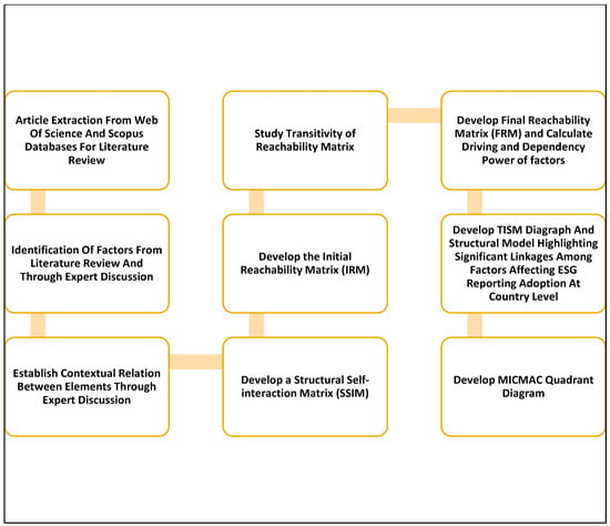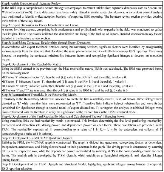 This structured analysis enhanced the understanding of the complex interrelationships among barriers, informing targeted interventions to facilitate ESG reporting adoption. Figure 2 illustrates the steps involved in the TISM and MICMAC analysis processes.