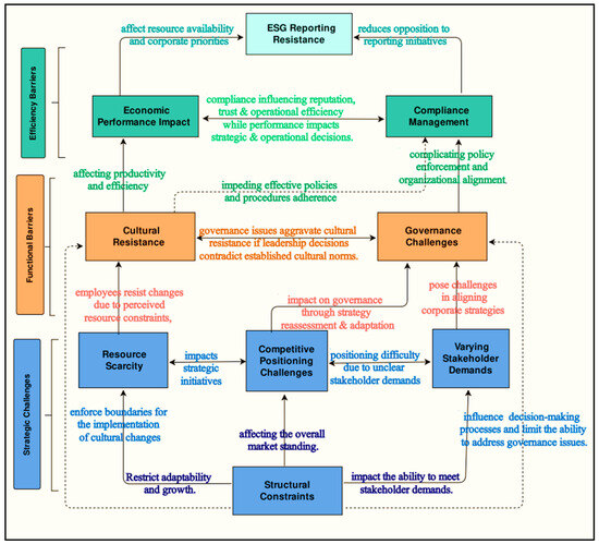 - Functional Barriers—Governance challenges (B2) and cultural resistance (B7) connected the dependent and independent barriers, allowing for a better understanding of the complexities involved with reporting execution. The organizational culture encouraged values of responsibility and created a system for implementing practices. Strong governance practices fostered a culture of transparency, accountability, and sustainability (Piwowar-Sulej 2022). Cultural resistance (B7) appeared as employee resistance to change. It frequently occurred when strategic decisions clashed with the established organizational culture. This resistance impacted the effectiveness of compliance management (B3) by affecting employee adherence to new compliance measures.