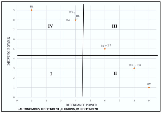 Table 5. FRM for corporate barriers model.Table 5. FRM for corporate barriers model.Critical Factors B1 B2 B3 B4 B5 B6 B7 B8 B9 Driving Power B1 1 1 * 1 * 1 1 1 1 * 1 * 1 9 B2 0 1 1 0 0 0 1 1 1 5 B3 0 0 1 0 0 0 0 1 1 3 B4 0 1 1 * 1 1 1 * 1 1 * 1 8 B5 0 1 * 1 * 1 1 1 1 * 1 * 1 8 B6 0 1 1 * 1 * 1 1 1 1 * 1 8 B7 0 1 1 * 0 0 0 1 1 1 5 B8 0 0 1 0 0 0 0 1 1 3 B9 0 0 0 0 0 0 0 0 1 1 Dependence power 1 6 8 4 4 4 6 8 9 * Transitivity Link - Determining the final level partitioning, reachability, antecedent and interaction sets for each factor: Determining the final level involved organizing barriers based on their influence within the system. This process began with identifying the reachability set. It included barriers that a given factor could affect. The antecedent set contained all barriers that could affect the given factor. The interaction set, representing mutual influence, was the intersection of these two sets. The driving and dependence power were computed by summing the rows and columns of the final reachability matrix. The FRM was then used to classify barriers according to their driving and dependence power.