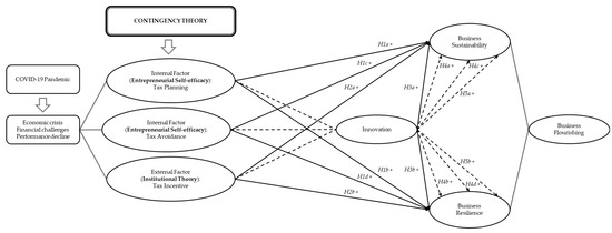 The notion of entrepreneurial self-efficacy and institutional theories, manifested through strategic tax avoidance and the utilization of tax incentives, respectively, can provide significant boosts to a company’s internal funding by reducing tax liabilities and enhancing financial flexibility (Fang et al. 2022; Kobbi-Fakhfakh and Bougacha 2023). However, increased internal funding does not automatically guarantee business sustainability and resilience because the role of business innovation heavily contributes to an organization’s ability to flourish (Schaltegger and Wagner 2011; Bradley et al. 2012). Innovation is crucial because it translates financial advantages into tangible improvements in products, services, and processes, which are essential for maintaining a competitive edge and adapting to market changes (Rogers 2004). In other words, without a strong emphasis on innovation, the benefits of tax savings and incentives may be short-lived, as businesses might fail to effectively capitalize on their financial resources. For instance, while reduced tax liabilities can provide immediate financial relief, it is the innovative strategies that enable companies to differentiate themselves in a crowded marketplace, respond to evolving consumer demands, and adapt to disruptions (Hughes et al. 2020). Thus, business innovation serves as a critical link between increased internal funding from various management strategies and achieving sustainable growth or operational resilience (Hall and Wagner 2012).