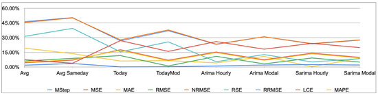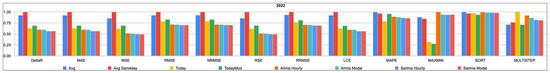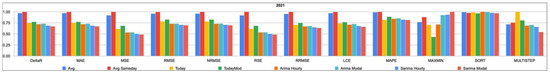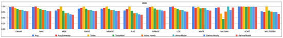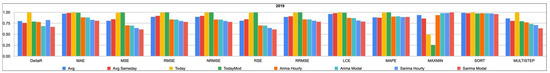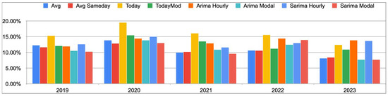 Table 4, Table 5, Table 6, Table 7 and Table 8 detail the value of each loss function for each price forecasting method from 2019 through 2023. Within each column, i.e., for each loss function, lower values indicate higher accuracy; however, due to the different nature of the loss functions, a comparison between their respective values is not immediate and will be presented in a more comparable form right after the raw data.