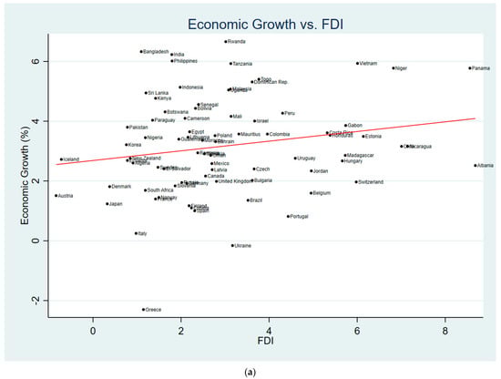 Scatter plots of economic growth vs. FDI and economic freedom. Note: economic growth (in percentage) was computed using real GDP per capita downloaded from the World Bank World Development Indicators, Foreign direct investments are the net inflows of investment to acquire a lasting management interest, and the economic freedom index was taken from the Fraser Institute.