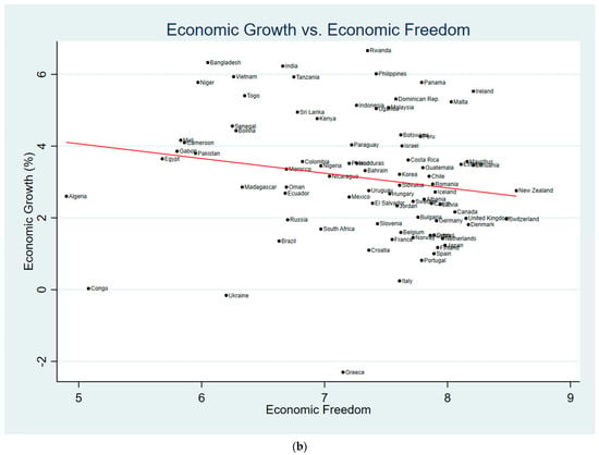 Figure 1 displays the average annual real GDP growth rate, FDI inflows, and economic freedom for the sampled countries over the entire period (2010–2019). The fitted line in Figure 1a shows a weak positive relationship between FDI and economic growth (R2 = 0.038). Meanwhile, the fitted line in Figure 1b illustrates a negative correlation between output growth and economic freedom (R2 = 0.092). The economic freedom of high-growth transition economies appears to cluster around the lower end of the index, while FDI inflows contribute positively to economic growth. However, the correlations do not imply the causation of FDI to economic growth. If economic freedom is vital in fostering economic growth, one would expect that FDI inflows and economic freedom are complements.