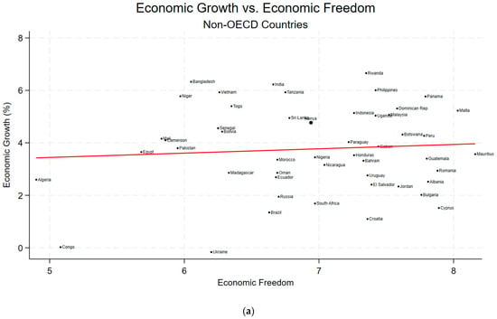 Figure 2 presents data from 2010 to 2019 to investigate the relationship between economic growth and FDI inflows in OECD and transition economies. The fitted lines reveal a significantly stronger positive correlation between FDI and economic growth in OECD countries than in non-OECD countries. While many non-OECD countries are currently in transition and experiencing relatively high economic growth, OECD countries appear to gain more advantages from FDI inflows. Figure 3 illustrates the relationship between economic freedom and growth, distinguishing between OECD and transition economies. The fitted lines show a weak positive correlation between output growth and economic freedom in non-OECD countries, while a negative correlation is observed in OECD countries. Although OECD nations typically create a more favorable environment for economic freedom, their output growth appears to decrease in response to changes in this freedom.