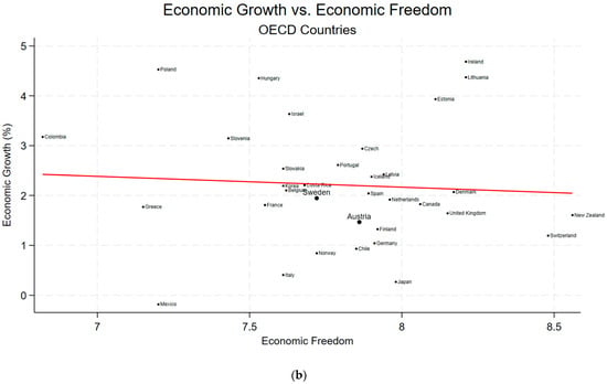 This study focuses on countries in distinct stages of economic development. In parts of the analysis, the distinction is made between OECD and non-OECD countries. A panel of 84 countries includes 34 OECD countries and 50 non-OECD countries over the 2010–2019 period. The variables included in the analysis are real GDP per capita, FDI inflows, economic freedom index, gross capital formation, population growth rate, labor force participation rate, and labor productivity. FDI inflows are the net inflow as a percentage of real GDP. Real GDP and gross capital formation are in constant 2015 US dollars. Labor productivity is output per employed person in constant 2015 US dollars. The population growth rate is the ratio between the annual increase in the population size and the total population. The labor force participation rate is the percentage of a country’s working-age population actively engaged in the labor market. Economic freedom is an index measuring the degree of freedom in a country comprised of five major components: (1) size of government, (2) legal structure and security of property rights, (3) access to sound money, (4) exchange with foreigners, and (5) regulation of capital, labor, and business.