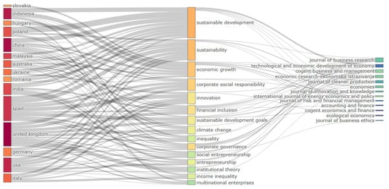 As a result of the systematic literature review, the relationship between keywords, countries, and scientific journals was also researched. The visualization of these interrelationships is by the tool of Bibliometrix “Three Fields Plot” developed based on the Sankey diagram. The chart allows a user-defined number of values of a variable (e.g., keywords used to describe the research topic) to be placed in a central position, and then values of two other variables (e.g., authors, countries, universities, sources, etc.) to be placed on either side of it. The Three Fields Plot shows how interest in and/or activity of the side variables is relative to the central variable.