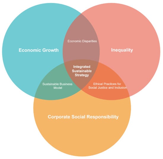 As a result of our research, we can conclude that the categories “Corporate Social Responsibility” (CSR), “Economic Growth”, and “Inequality” interact in a specific way, generating added value and synergy, reflected in the following connections: between CSR and economic growth, a sustainable business model is formed, which not only improves the financial performance of companies but also contributes to their long-term stability. The relationship between CSR and inequality manifests in the development of ethical practices for social justice and inclusion, leading to a more equitable distribution of resources and opportunities in society. On the other hand, economic growth and inequality deepen economic disparities, potentially creating new social challenges.