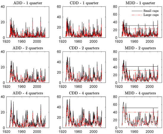 Evolution of ADD, CDD, and MDD over non-overlapping subsamples. The figure displays the evolution in percentage of ADD, CDD, and MDD over various non-overlapping subsamples (from one to four quarters) between 1926 and 2020. The straight line on right plots corresponds to CED. The black lines correspond to the small caps, the red dashed lines to the large caps. CED is computed with 376, 188, and 94 observations for the one-quarter, two-quarter, and four-quarter horizons, respectively.