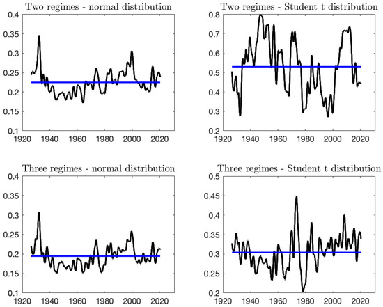 In Figure 2, we represent the filtered probability of being in the low regime for the two-regime and three-regime models. First, we note that the two-regime/Student’s t model produces a high filtered probability (on average above ), suggesting that this regime actually does not capture bear markets. Second, the filtered probabilities in the two-regime and three-regime models with normal innovations exhibit similar temporal evolution. Peaks occur at the same times with similar probabilities. However, these peaks do not always coincide with actual market downturns. The first peak occurs in June 1932, after the Wall Street crash of October 1929. The second peak corresponds to the oil crash in mid-1973. The third peak in May 1984 could not be associated with any market downturn. The fourth peak, which occurred in October 1999, corresponds to the dotcom crash. The last peak in September 2014 again does not correspond to any large market decline. Consequently, models with normally distributed innovations do not accurately capture observed market downturns.