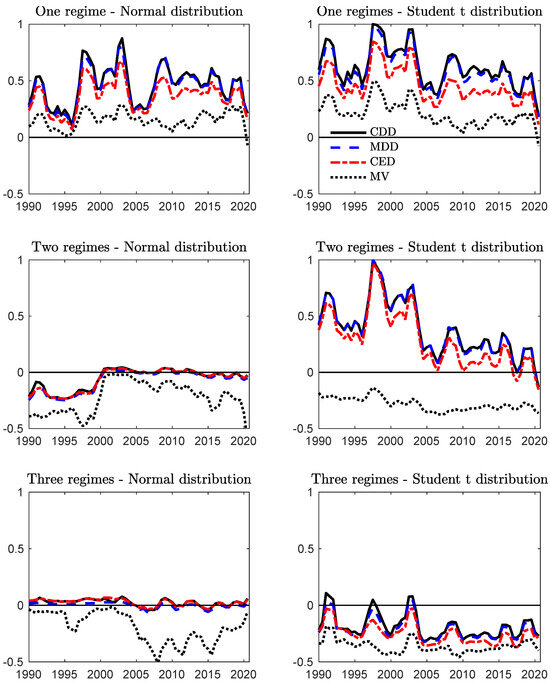 | 14 | This conclusion appears very robust and not driven by the choice of starting values. We experimented with several sets of starting parameter values and obtained the same parameter estimates for both models. A similar phenomenon—where the probability of remaining in the bear state is lower with normal innovations than with Student’s t innovations—was reported by Haas and Paolella (2012) and Haas and Liu (2018). |