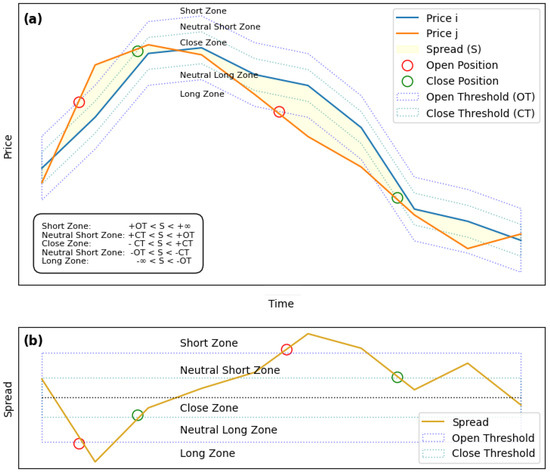A graphical visualization of pair trading is presented in Figure 1. Figure 1a shows the market interactions according to the Spread (S) and thresholds. A position is opened whenever the spread deviates beyond the open threshold. The position closure happens when the spread reverts below the close threshold. Figure 1b, which shares the same time axis with (a), is a stretched view of (a). It presents the corresponding actions with the crossing of Spread (S) and zones. The spread deviations are classified into zones based on the Spread (S), Open-Threshold (), and Close-Threshold () Equation (2):