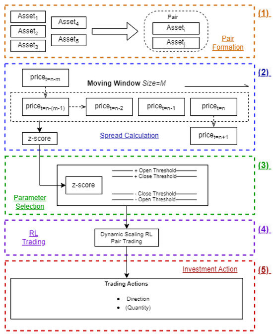 In this section, we introduce the architecture of the methodology (Figure 2). The architecture includes five steps: (1) pair formation for selecting assets to form a tradeable pair (Section 4.1); (2) spread calculation utilizing the moving-window technique to extract the spread in a limited retrospective time frame (Section 4.2); (3) parameter selection from an historical dataset to decide the most suitable hyperparameters for pair trading (Section 4.2); (4) RL trading by allowing RL to decide the trading timing and quantity in pair trading (Section 4.4); (5) investment action for taking the actions produced from RL trading into market execution.