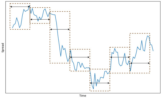 The second step is a moving window mechanism to capture the spread movement (Figure 2 Step-2). Spread is calculated at every selected trading interval (e.g., every five minutes) and is the error term s from a regression between the two prices and . and are the intercept and slope, respectively, which follow a normal distribution with a mean of 0 and a standard deviation of Equation (7):