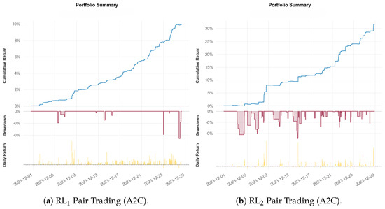 Behavior-wise, PPO, DQN, and SAC tend to conduct excessive transactions that are not profitable. On the contrary, A2C have fewer trades but higher profits on each trade. RL2 pair trading shows further fewer total actions because of the adjusted position action, where we do not consider a position adjustment as one trade until it is closed. Apart from the result in Table 5, the portfolio growth trend with the best-performing RL algorithm agent is presented in Figure 6 (a comparison with Gatev et al. (2006) is provided in Figure A1a in the Appendix). Most of the pair trading experiments, including Gatev et al. (2006), RL1, and RL2, display a stable upturn, which is ideal from the perspective of pair trading. From the drawdown graphs, we can observe that RL1 produces fewer drawdowns compared to the non-RL pair trading method from Gatev et al. (2006) and has a significantly higher win/loss action ratio due to differences in threshold settings. However, RL1’s cumulative profit is not consistently higher, and when transaction fees are zero, its cumulative profit is slightly lower than that of the Gatev et al. method. RL2 displays the strongest profitability, despite a lower win/loss action ratio, due to its progressive trading strategy. In general, all three pair trading methods show the ability to generate stable income in a volatile trading market.