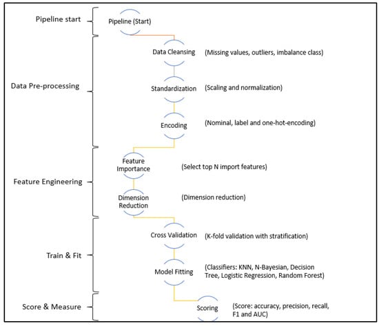 Scikit-learn allows for the full analytics pipeline to specifically unravel the underlying pattern in data sets, therefore resulting in the best fitting for various classifiers. The pipeline contains end-to-end processes that performs these tasks: (i) ingest the data sets and perform preliminary data analysis to identify missing values, outliers and imbalanced class—any missing values will be imputed and imbalanced data is identified; (ii) standardize data which includes scaling and normalization to ensure consistent model performance; (iii) encode categorical (nominal and ordinal) and one-hot-encode for predictors and label for target variable; (iv) select top N most influential predictors and reduce total dimension to the influential ones; (v) cross validate using k-fold stratified to ensure the ratio of imbalance remains intact and subsequently treated by SMOTE as suggested by