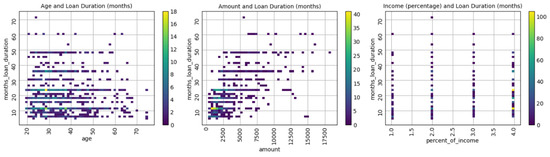 Figure 2. The only correlation of 0.6250 shows a positively trending linear relationship. However, “age” and “percent of income” do not show a visual pattern and therefore do not indicate a relationship with “months loan duration.”