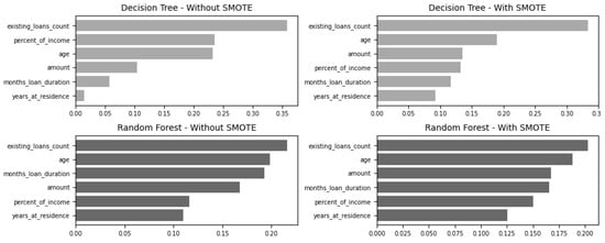Table 10) sets. For example, the five metrics (accuracy, precision, recall, F1 and AUC) hover below 0.8000 for the German credit data set. This shows that the default hyper-parameters are not sufficiently tuned to uncover the hidden pattern in both data sets. Using AUC as a more robust measurement, it is shown that k-nearest neighbour and decision tree are the two worst performing classifiers with 0.6746 and 0.5821, respectively, with untreated and imbalanced data. Interestingly, none of the five classifiers perform better when imbalanced data is treated with SMOTE. Only k-nearest neighbour improves marginally.