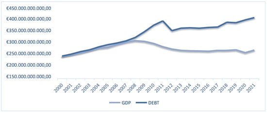 In Figure 1. we represent the time evolution of the central government’s debt and GDP. We observe that in 2008–2009, there was a considerable rise in debt in relation to the GDP at a rate of 17%, and the GDP in 2008 took the max value of EUR 241,990,389,906.67. From then on, the GDP decreased until to 2019, which was stopped due to the coronavirus crisis. In contrast, the debt has a continuously increasing trend, which reached, in 2021, 213.82% of the GDP.